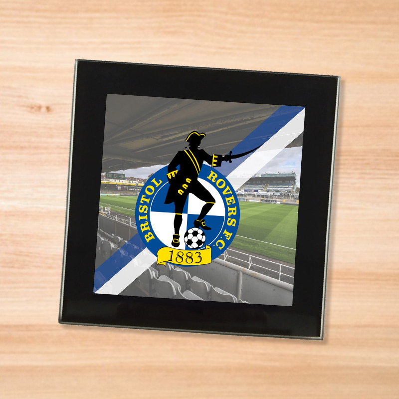 Available in durable clear plastic or premium glass with a stylish black surround and soft felt backing, these coasters don’t just look amazing — they also protect your surfaces from marks, scratches, heat and condensation. Showcase your passion for your club with this Bristol Rovers coaster. Featuring the club crest set against a high resolution image of the stadium, and the team’s primary colours.