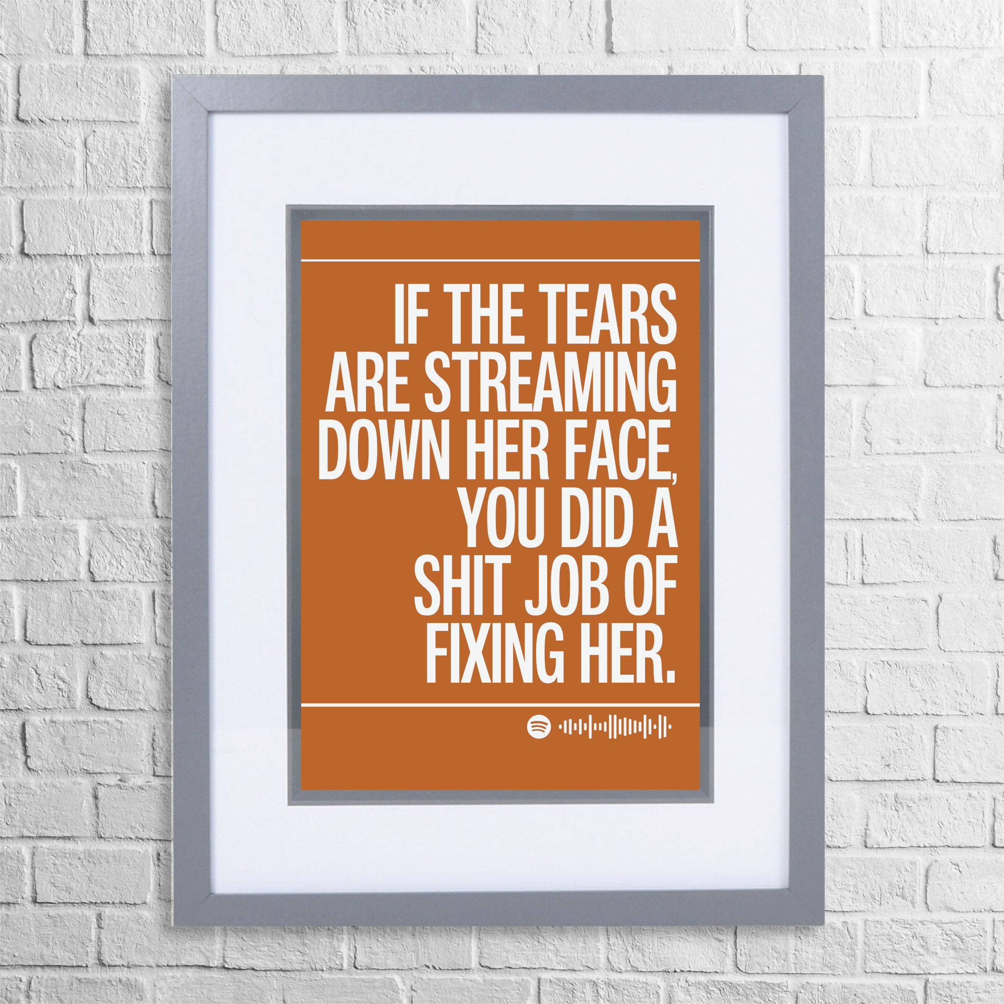 Bring a touch of dry humour and musical nostalgia to your walls with this bold, text-based art print inspired by Fix You by Coldplay. Featuring the words:
